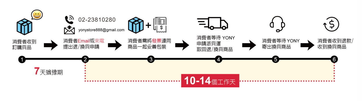 退/換貨總流程預計10-14個工作天,需視貨運物流實際狀況為主。