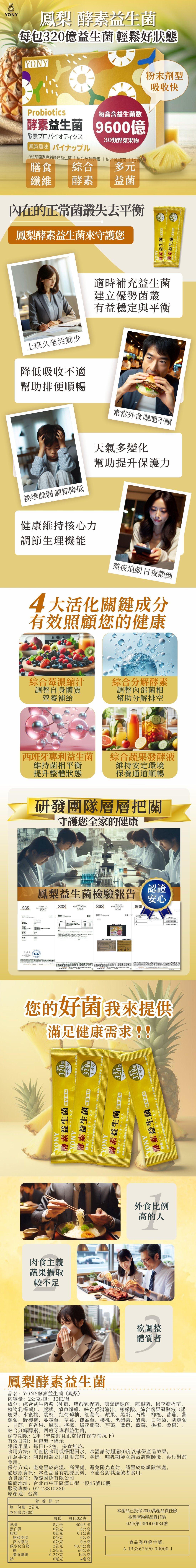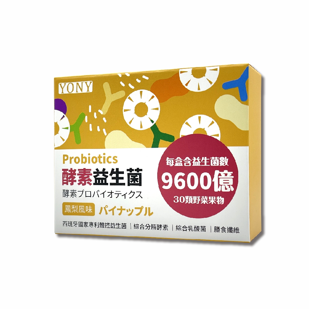 YONY 鳳梨益生菌配方,精選多重益菌與酵素營養成分,補充每日所需營養,幫助維持順暢與體內良好平衡。